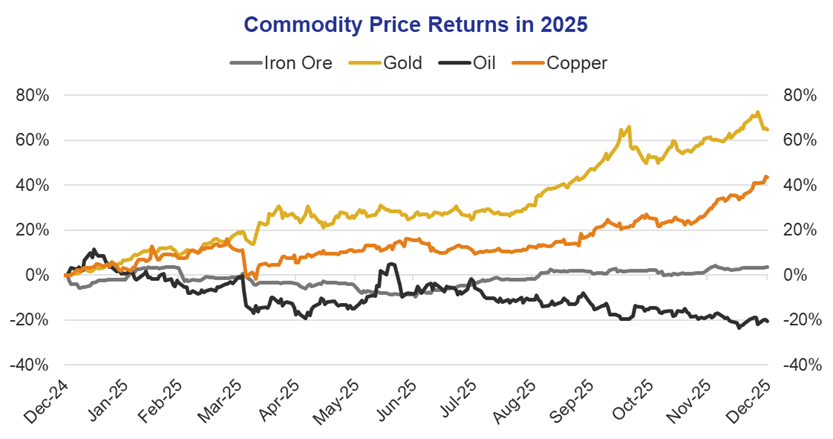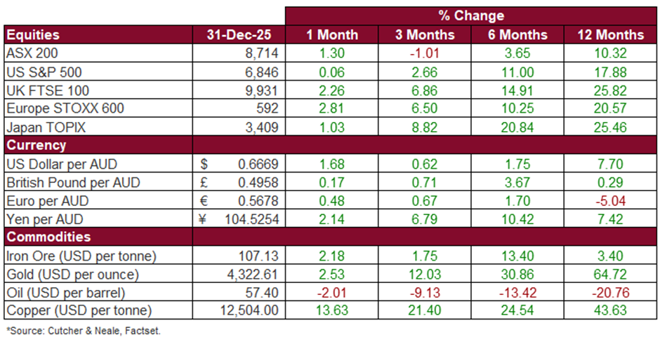 Global markets finished 2025 higher, despite several sharp swings in sentiment driven by trade policy, inflation trends and changing expectations for interest rates. The most significant volatility occurred around April’s “Liberation Day” tariff announcement, which triggered a broad sell-off before markets stabilised as implementation was delayed and negotiations progressed. By year-end, investor confidence had been supported by resilient economic activity and strong corporate earnings. The US Dollar also weakened materially, falling 9.37% against a basket of major currencies over the year. Commodities were a major feature of the tape, with gold rising 64.72% and copper up 43.63%, reflecting a mix of safe-haven demand and ongoing industrial and electrification themes.