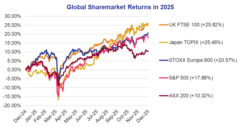 Quick TakeGlobal markets navigated a volatile but ultimately positive year in 2025: Equities finished higher despite repeated swings in sentiment driven by trade policy, inflation trends and changing interest rate expectations. The sharpest disruption occurred in April following the “Liberation Day” tariff announcement, which triggered a broad sell-off before markets stabilised as implementation was delayed and negotiations progressed. As the year unfolded, resilient economic activity and strong corporate earnings helped restore confidence. Major developed markets delivered solid returns as monetary policy paths became clearer: In the United States, the S&P 500 rose 17.88%, the Nasdaq climbed 21.14% and the Russell 2000 gained 12.81%, supported by AI-related investment and a resilient consumer. European equities also performed strongly, with the STOXX Europe 600 up 20.57% as easing inflation and resilient earnings supported confidence. In Australia, the ASX 200 rose 10.32%, recovering from a sharp April drawdown before conditions became more uneven through the second half as concerns about inflation increased. Overall, 2025 delivered solid equity returns despite recurring bouts of volatility: While markets adjusted at times to shifting expectations around interest rates, trade and inflation, underlying economic resilience and earnings strength helped support confidence into year-end. December reinforced how quickly sentiment can shift as new information emerges, but it also highlighted the market’s ability to absorb uncertainty without a sustained deterioration in conditions. As attention turns to 2026, the focus will remain on the inflation outlook, the direction of monetary policy, and the evolution of global trade arrangements. |