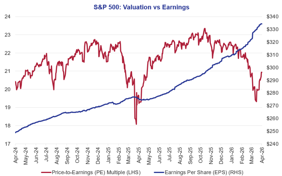 Markets have already priced in a fair amount of bad news through lower price-to-earnings multiples, while earnings expectations have remained relatively resilient. That does not remove the risk, but it does suggest equities are entering this period from a firmer starting point than the headlines alone might imply.