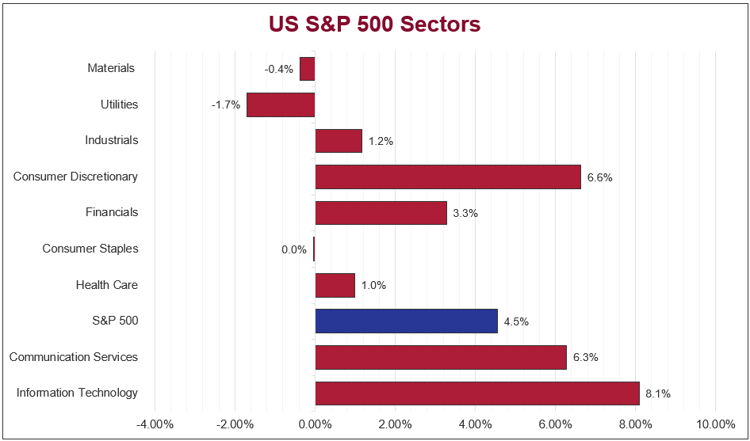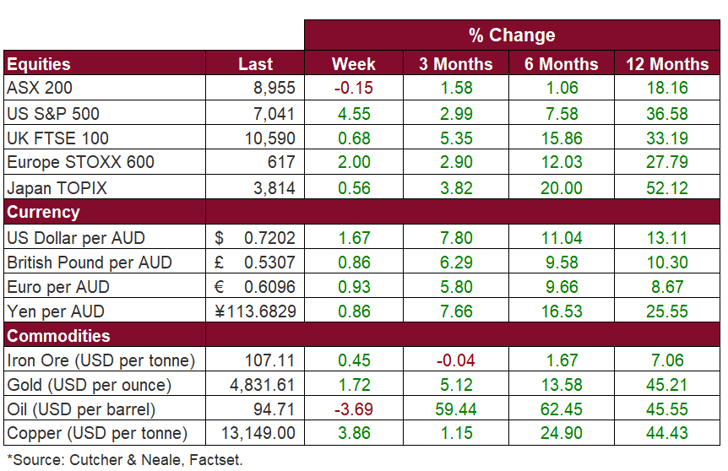 US sharemarkets surged over the week, with the S&P 500 up 4.5% and the NASDAQ rising 1.5%. Sentiment was supported by easing US-Iran tensions, which pushed oil prices lower and helped reduce inflation concerns. The Information Technology sector (8.1%) led the rally, followed by Consumer Discretionary (6.6%) and Communication Services (6.3%), driven by continued strength in AI-related names. In contrast, the Energy sector (-3.5%) lagged, weighed down by falling crude prices, while supportive economic data and strong investor positioning underpinned the broader market strength.
