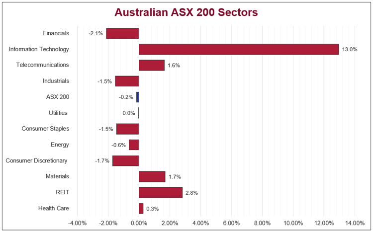 The Australian sharemarket finished the week broadly flat, with the ASX 200 down -0.2% as strong early-week volatility eased and investors consolidated recent gains amid shifting global sentiment. Markets were influenced by developments in US-Iran negotiations, which drove swings in oil prices and briefly lifted inflation concerns before sentiment stabilised. The Information Technology sector (13.0%) was the standout performer, extending its rebound on continued strength in AI-related stocks. The REITs sector (2.8%) also rose, supported by easing bond yields, while Materials (1.7%) edged higher. In contrast, Energy (-0.6%) lagged as oil prices retreated, while Financials (-2.1%) also softened toward the end of the week.