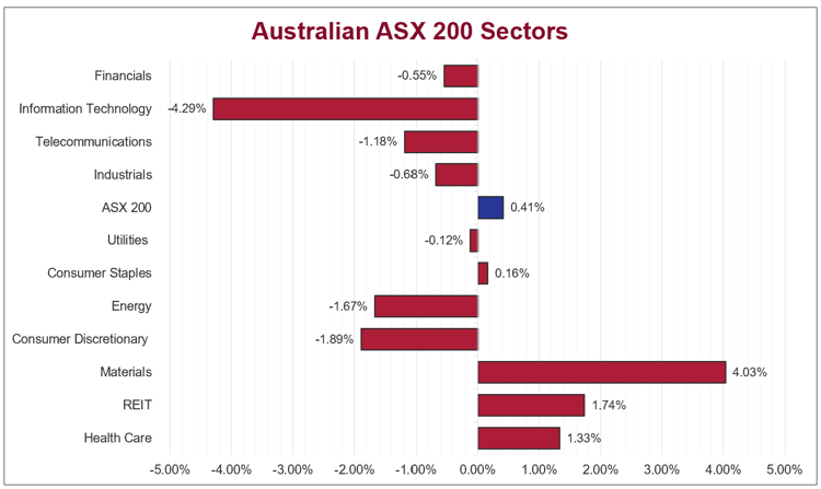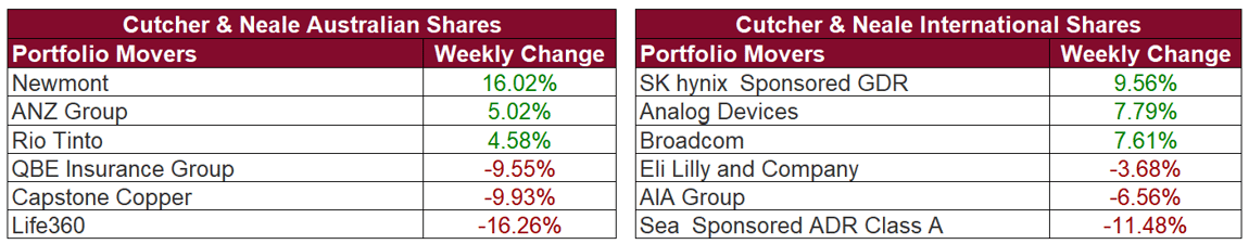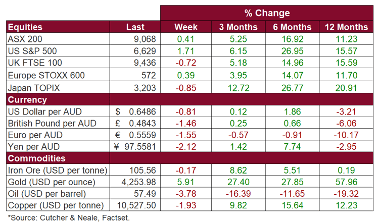 The Australian sharemarket posted a modest gain over the week, as the ASX 200 rose 0.4% despite Friday’s retreat. The industry sectors were volatile, however strength in Health Care (+1.3%), Materials (+4.0%) and REITs (+1.7%) supported the market, while the Energy (-1.7%) and Information Technology (-4.3%) sectors underperformed. Precious metals miners and copper names outperformed as gold prices continued to rally and copper strengthened on supply concerns. Softer domestic labour data and expectations of lower rates provided a tailwind for defensive sectors such as REITs, Utilities, and Consumer Staples. Overall, the week reflected a cautious but constructive tone, balancing global uncertainties with domestic support from defensives and commodity-linked sectors.
