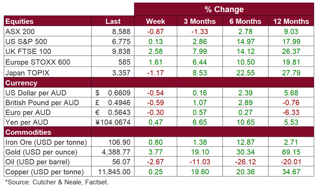 European sharemarkets finished the week modestly higher, as the STOXX Europe 600 extended its advance as it gained 1.6%. Central banks were in focus, as the European Central Bank held rates steady, while the Bank of England delivered a 0.25% cut, however struck a cautious tone, reinforcing expectations of gradual rather than aggressive easing. Economic data was mixed, UK inflation and labour data weakened, underpinning rate-cut expectations into 2026. As for the sector performances, markets were led by the Financial Services (+4.4%) sector and the Basic Resources (+3.3%) sector, while the Technology (-0.9%) and Health Care (-0.7%) sectors lagged.