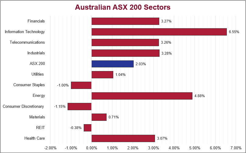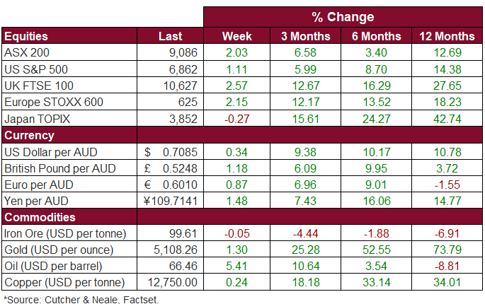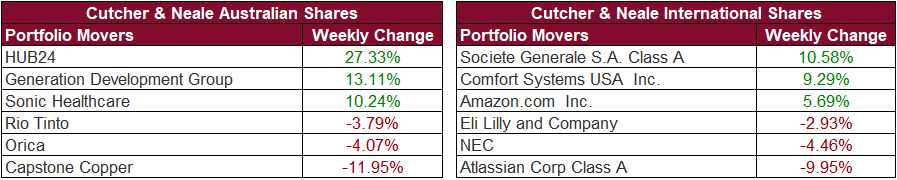 The Australian sharemarket continued on its positive streak last week, advancing a further 2.0% as stronger than expected corporate earnings drove optimism and performance. Key earnings from JB Hi-Fi and BHP provided confidence in consumer and materials sectors, while solid results from Sonic Healthcare added midweek momentum. The Energy (4.9%) sector outperformed on a 5.4% increase in crude oil after escalating US–Iran tensions. The stock specific standout over the week was HUB24, which surged 27.3%, after the company reported net profit for the first 6 months, up 70% from last year.