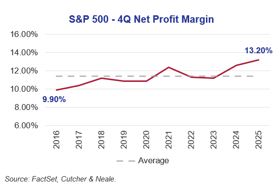 With around three-quarters of companies having reported, the S&P 500 has so far delivered annual earnings growth of 13.2% for the December 2025 quarter. If that holds, it will mark the fifth consecutive quarter of double-digit earnings growth. Revenue growth is running at 9.0%, the strongest pace in three years. Meanwhile, net profit margins have climbed to 13.2%, above both last year and the 10-year average. If maintained, this will mark the highest level of profitability seen by FactSet since it started tracking it back in 2009!