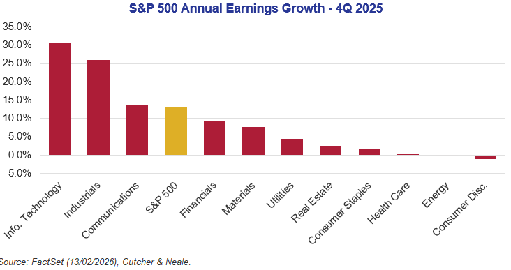 But it’s no longer a one-sector show. What’s different now is that other parts of the market are starting to contribute more meaningfully. Industrials are reporting earnings growth of 26%, boosted by data centre related demand. Communications and parts of Financials have also seen solid upgrades.