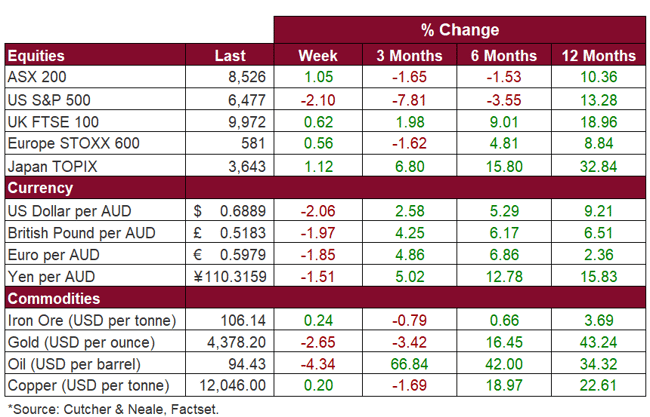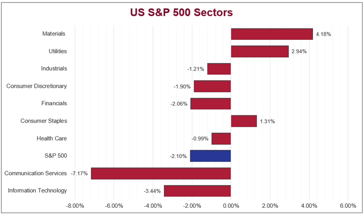 US sharemarkets were weaker last week, with the S&P 500 (-2.1%) and NASDAQ (-3.2%) declining, as geopolitical uncertainty and continued weakness in technology stocks weighed on sentiment. The Iran conflict remained a key focus, driving volatility amid shifting de-escalation headlines. The Information Technology sector (-3.4%) was a key drag, pressured by declines in big tech, semiconductors, and software, while the Communication Services sector (-7.2%) also saw notable weakness. In contrast, the Energy sector (6.2%) outperformed on higher oil prices, with the Materials sector (4.2%) also stronger on gains by commodity-linked names.
