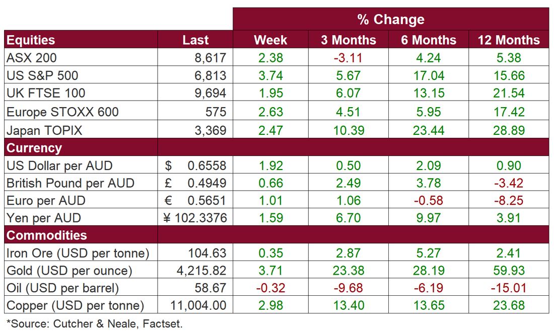 European sharemarkets also rebounded strongly, as the Euro STOXX 600 added 2.6%. Improved geopolitical sentiment, and increased expectations of a December US Federal Reserve rate cut aided markets. The UK Budget delivered a larger-than-expected fiscal buffer funded by tax rises, reinforcing market expectations of a near-certain December Bank of England cut, though long-term growth concerns persisted. ECB commentary suggested policy is likely on hold as inflation continues to moderate, while upcoming eurozone readings are expected to remain near the 2% target. Sector performance was positive, as the Basic Resources, Construction, Banks, and Information Technology led the gains.
