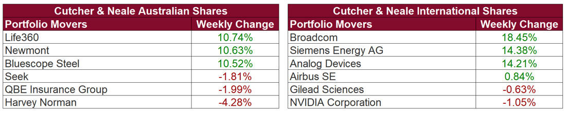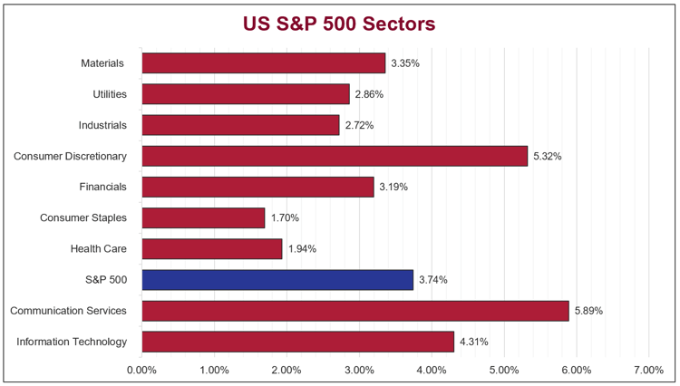 US sharemarkets extended their late-November rebound, as the S&P 500 gained 3.7%, boosted by rising expectations of a December Federal Reserve rate cut. Strong performances from Artificial Intelligence (AI) linked names and a series of positive retail earnings results aided the strong market performance. Improved US-China trade headlines also helped sentiment. However, several headwinds persisted, including competition concerns regarding major AI players like NVIDIA and Google. Economic worries remained in focus as consumer confidence weakened, affordability issues worsened, and key manufacturing data disappointed. All of the industry sectors finished the week in positive territory; Communication Services jumped 5.9% and Information Technology rose 4.3%.