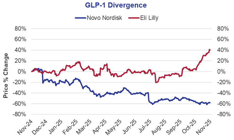 Over the past few years, we have watched with interest as the newfound GLP-1 obesity and diabetes drug market surged into mainstream health care. Two names, Novo Nordisk and Eli Lilly, have dominated these new markets. While Novo Nordisk was the pioneer, Eli Lilly has more recently taken the clear lead and shown us perhaps one of the most visceral examples of a pairs trade we’ve seen.