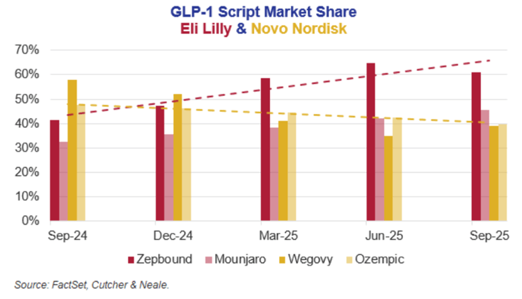 In contrast, Eli Lilly has hit milestone after milestone. Its GLP-1 drugs Zepbound and Mounjaro have not only matched Ozempic and Wegovy in efficacy, but they’ve also now surpassed them in script market share.