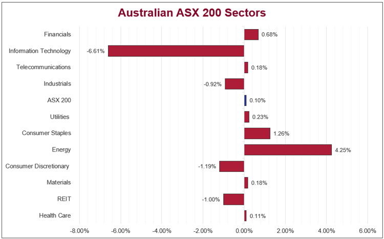 The Australian sharemarket ended the week slightly higher, with the ASX 200 up 0.1%, as gains in the Energy (+4.3%) and Consumer Staples (+1.3%) sectors offset weakness elsewhere. The Information Technology (-6.6%) sector led declines, while the Consumer Discretionary (-1.2%), Industrials (-0.9%) and REITs (-1.0%) sectors also lagged. The Australian Dollar remained near US$0.70, and yields held close to multi-year highs. Broader market moves reflected a mix of profit-taking in weaker sectors and selective buying across Energy and Consumer Staples, as investors positioned cautiously ahead of this week’s RBA decision on monetary policy.