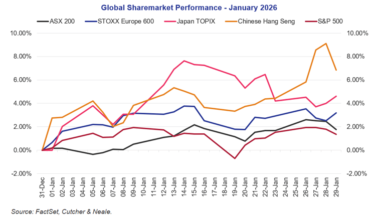 Gold (+13.3% calendar year-to-date) continues its remarkable run, breaking through the US$5,000 level last week. Meanwhile, Silver (+43.3%) has gone parabolic, responding to heightened geopolitics in addition to an underlying industrial upswing that’s similarly supported Copper (+6.9%). It should be noted that commodities all slumped in the final day of the month, after news Trump nominated Kevin Warsh to be the next US Federal Reserve Chair. Warsh was seen as a more sensible choice and perhaps less of a loyalist dove compared to some other candidates.
