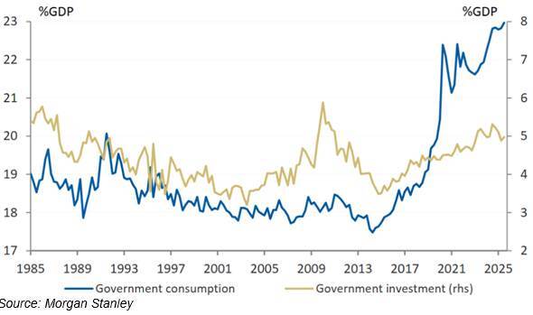 Productivity matters for the budget because it helps understand the broader problem in the economy. Growth is softer, inflation is still uncomfortable. Plus, the public sector has become a much bigger part of the picture. Government consumption of goods and services now sits at around 23% of GDP, well above the historical average. Meanwhile, total government payments, which also includes transfer payments like the age pension and jobseeker, make it closer to 27% of GDP.