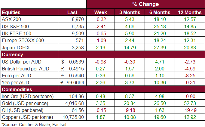 US sharemarkets pulled back last week, with broad-based losses, as geopolitical developments shook up all major indices. A large sell-off on Friday attributed most of the losses, after President Trump on social media called out a hostile trade attitude from China and also threatened a large increase in tariffs on Chinese products. The government shutdown, softening labour market statistics and concerns around the sustainability of the current AI run were also key drivers. The Energy and Consumer Staples sectors were the biggest detractors, falling 4.0% and 3.3% respectively. On the other hand, the Utilities (1.4%) and Consumer Staples (0.6%) sectors provided some relief to the market, with energy drink company, Monster Beverage, a stock standout, advancing 3.7%.