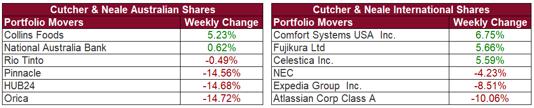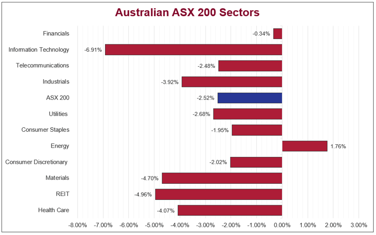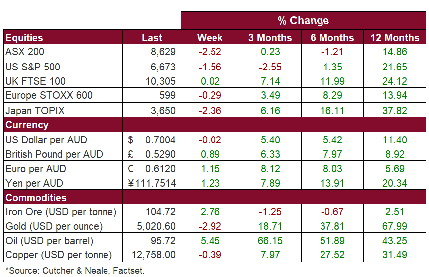 The Australian sharemarket fell sharply this week, with the ASX 200 down -2.5% as escalating Middle East geopolitical tensions rattled global markets. The Energy sector (+1.8%) provided a rare source of support, rising alongside crude oil amid heightened supply concerns, though higher energy costs added to inflation fears, pushing markets to price a 0.25% RBA rate hike this Tuesday. The Materials (-4.7%), REIT (-5.0%) and Information Technology (-6.9%) sectors underperformed amid trade disruptions and broad risk-off sentiment. Overall, geopolitical uncertainty and hawkish central bank expectations drove the broadest weekly decline since December.