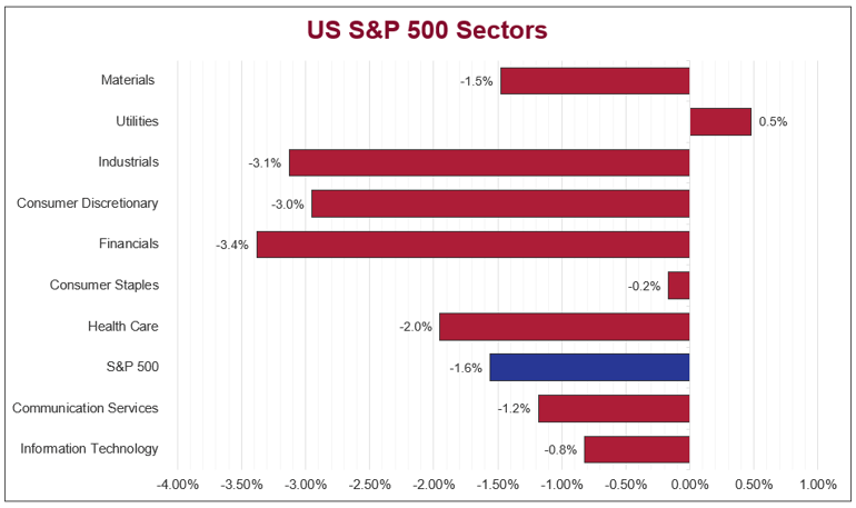 US sharemarkets hit a new low for the year last week, marking their third consecutive weekly loss, with the S&P 500 down -1.6% and the NASDAQ falling -1.3%, as escalating Middle East tensions and surging oil prices weighed on investor sentiment. The Financials (-3.4%) and Industrials (-3.1%) sectors led declines, reflecting weakness in banks, transports, and consumer-facing companies, while major technology stocks, including Meta Platforms (-4.8%) and Microsoft (-3.3%), pressured broader indices. The Energy (+2.2%) sector outperformed, bolstered by the spike in crude prices, partially offsetting broader market weakness.