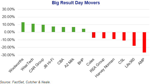 Retail offers a good example of the divergence. Supermarket giant Coles delivered a respectable result, yet its shares fell 7.4% after investors focused on slower sales growth relative to rival Woolworths, which jumped 13.0% on its result.