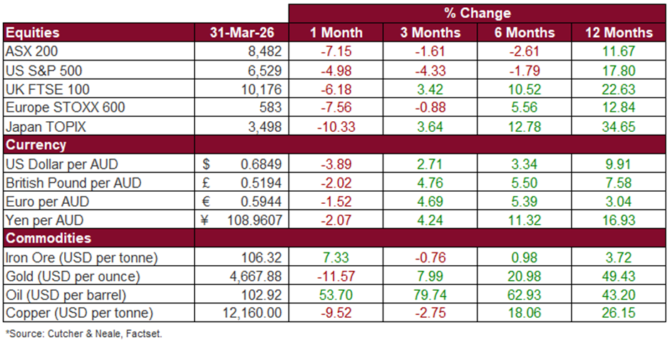 Quick TakeGlobal markets turned sharply lower in March as geopolitics displaced the more constructive tone seen earlier in the year: The escalation of conflict in the Middle East, and the resulting disruption to global energy supply, drove a sharp rise in oil prices and reignited concerns around inflation, interest rates and growth. US equities fell across the board, with the S&P 500 down 4.98%, the Nasdaq down 4.68%, and the Russell 2000 down 5.00%. Europe also weakened materially, with the STOXX Europe 600 falling 7.56%, while Australia’s ASX 200 declined 7.15%, its weakest month since mid-2022. In the US, the key theme was the market impact of the Iran conflict and the associated energy shock: The near closure of the Strait of Hormuz pushed oil prices sharply higher, lifted bond yields, and reduced expectations for near-term rate cuts. The Federal Reserve left rates unchanged at 3.50% to 3.75% and signalled a more cautious stance on easing, while softer economic data pointed to a more stagflationary backdrop. Even so, markets showed some resilience at times, supported by corporate buybacks and still solid earnings expectations. In Europe and Australia, higher energy costs and tighter policy settings weighed heavily on sentiment: Europe was particularly exposed given its reliance on imported energy, with rising oil and gas prices driving weaker confidence, slower activity and higher inflation expectations. In Australia, the RBA lifted the cash rate by 0.25% to 4.10%, while the ASX 200 fell 7.15% and the Australian Dollar weakened to US$0.6849. Overall, March marked a clear shift in market conditions, with investors increasingly focused on inflation, policy restraint and the risk to global growth. |