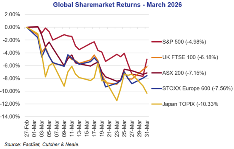 Global equity markets experienced a sharp reversal in March, as a significant geopolitical shock disrupted the relatively constructive backdrop seen earlier in the year. In the US, the S&P 500 declined 4.98% and the Nasdaq fell 4.68%. The Russell 2000 also weakened, falling 5.00%. European markets moved similarly lower, with the STOXX Europe 600 down 7.56%, while the FTSE 100 declined 6.18%, the DAX fell 10.30%, and the CAC dropped 8.81%. In Australia, the ASX 200 declined 7.15%, marking its weakest monthly performance since mid-2022. The primary driver of market weakness was the escalation of conflict in the Middle East, which led to a sharp rise in oil prices and renewed concerns around inflation, interest rates and global growth.