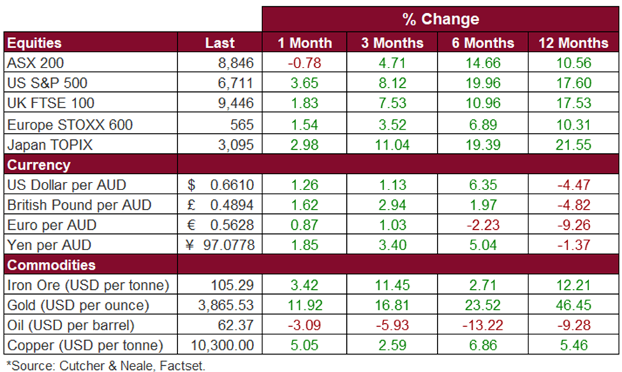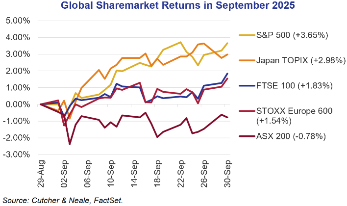Global equity markets ended mostly higher during September, as optimism around monetary easing in the US contrasted with political uncertainty in Europe and weakness in Australian shares. Commodity markets also saw divergence, with gold and copper advancing to fresh highs, while oil extended its recent slide. Investors weighed the continuation of the Federal Reserve’s rate-cutting cycle, ongoing tariff developments and shifting growth signals across major economies.