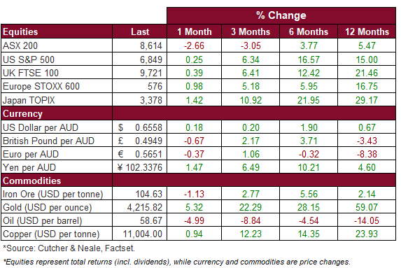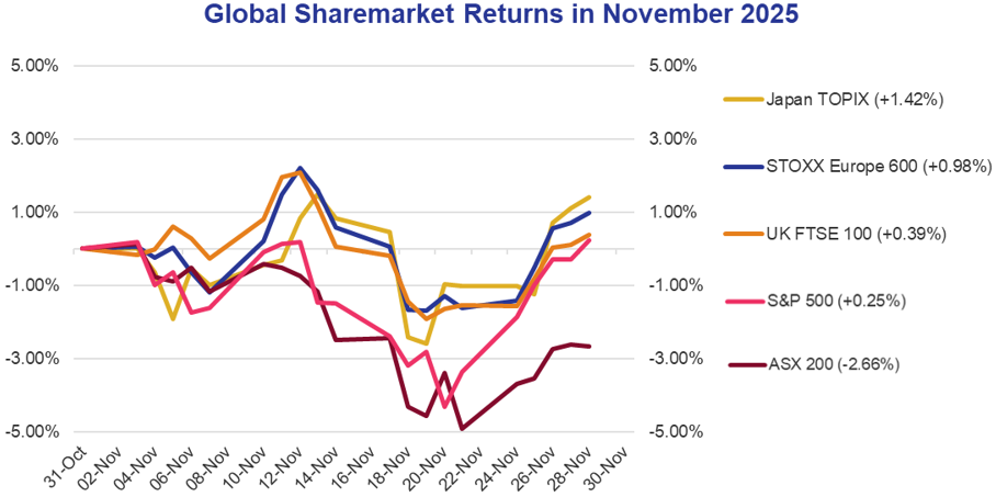 Quick TakeGlobal volatility amid shifting rate expectations: Global equity markets were mixed in November as investors weighed sticky inflation, evolving interest rate expectations and ongoing geopolitical risks. The S&P 500 rose 0.25%, the Dow gained 0.48%, while the Nasdaq fell 1.45% and the Russell 2000 added 0.96%. US markets swung sharply during the month before recovering into month-end, helped by a late shift towards a high probability of a December Federal Reserve rate cut. US bond yields eased, with the 2-year falling to 3.50% and the 10-year to 4.03%, while gold continued its strong run. Europe steadies on earnings resilience and policy clarity: In Europe, the STOXX Europe 600 rose 0.98%, with several major indices remaining near record highs. Sentiment improved as inflation stayed benign, Q3 earnings beat expectations and forward profit forecasts were revised higher. Central banks largely held policy steady, while softer UK inflation at 3.6% and weaker labour data saw markets price in a greater likelihood of Bank of England rate cuts. French political and budget uncertainty persisted but did not derail the broader improvement in the regional outlook. Australia lags as sticky inflation restrains optimism: In Australia, the ASX 200 fell 2.66%, its weakest month since March, as cautious earnings updates and offshore leads weighed on sentiment. The Reserve Bank left the cash rate at 3.60% but flagged lingering inflation pressures, reinforced by stronger employment data and a hotter monthly CPI print. Bond yields moved higher across the curve, while the Australian dollar was broadly steady, rising 0.18% to US$0.6558. |